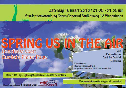 Op zaterdag 16 maart organiseren we voor de derde keer een dansfeest voor een goed doel; deze keer een duofiets voor de bewoners van verzorgingshuis ‘Pieter Pauw’ in Wageningen. Het wordt weer een schitterend feest bij studentenvereniging Ceres in Wageningen, met DJ Monica, de band ‘The Beatniks’ en natuurlijk weer het Rad van Fortuin, met prachtige prijzen!